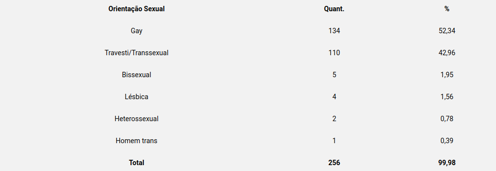 Aparecem logo após a Bahia, em número de óbitos, o estado de São Paulo (25 registros) e Pernambuco (com 20). Em todo o país, 256 lésbicas, gays, bissexuais, transsexuais, transgêneros, assexuais e outras pessoas que se identificam no amplo espectro da diversidade de sexualidade e gênero, foram vítimas de morte violenta – ao todo, foram 242 homicídios (94,5%) e 14 suicídios (5,4%).