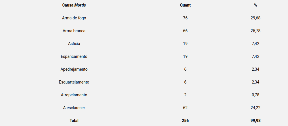 São recorrentes os casos em que armas de fogo são usadas nos crimes contra este público (essa causa mortis ocupa 29,6% dos registros). Os demais métodos utilizados pelos autores e autoras para cometer crimes contra a população LGBTQIA+ são armas brancas (25,7%), asfixia, espancamento, apedrejamento, esquartejamento e até mesmo atropelamento proposital.