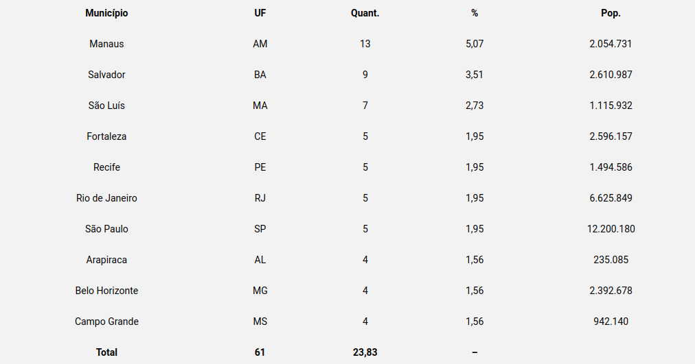 Salvador, onde 9 dos crimes identificados pelo grupo foram computados, figura como o 2º município brasileiro com o maior quantitativo de óbitos. Ao todo, 155 cidades tiveram casos notificados pelo levantamento, que obtém as informações através da coleta de fatos noticiados pela mídia.