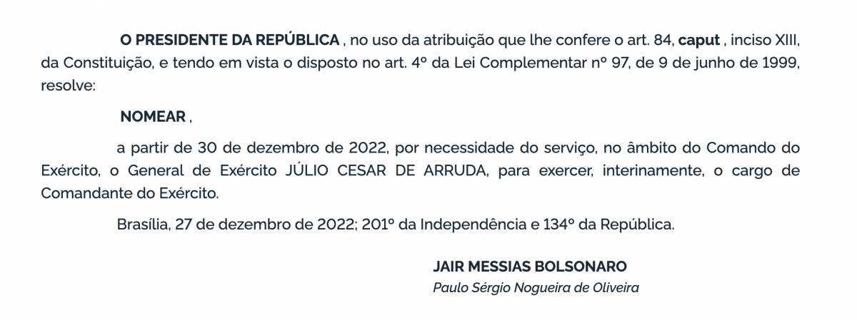O general Júlio Cesar de Arruda foi nomeado pelo presidente Jair Bolsonaro (PL) para assumir o comando do Exército de forma interina a partir de 30 de dezembro.